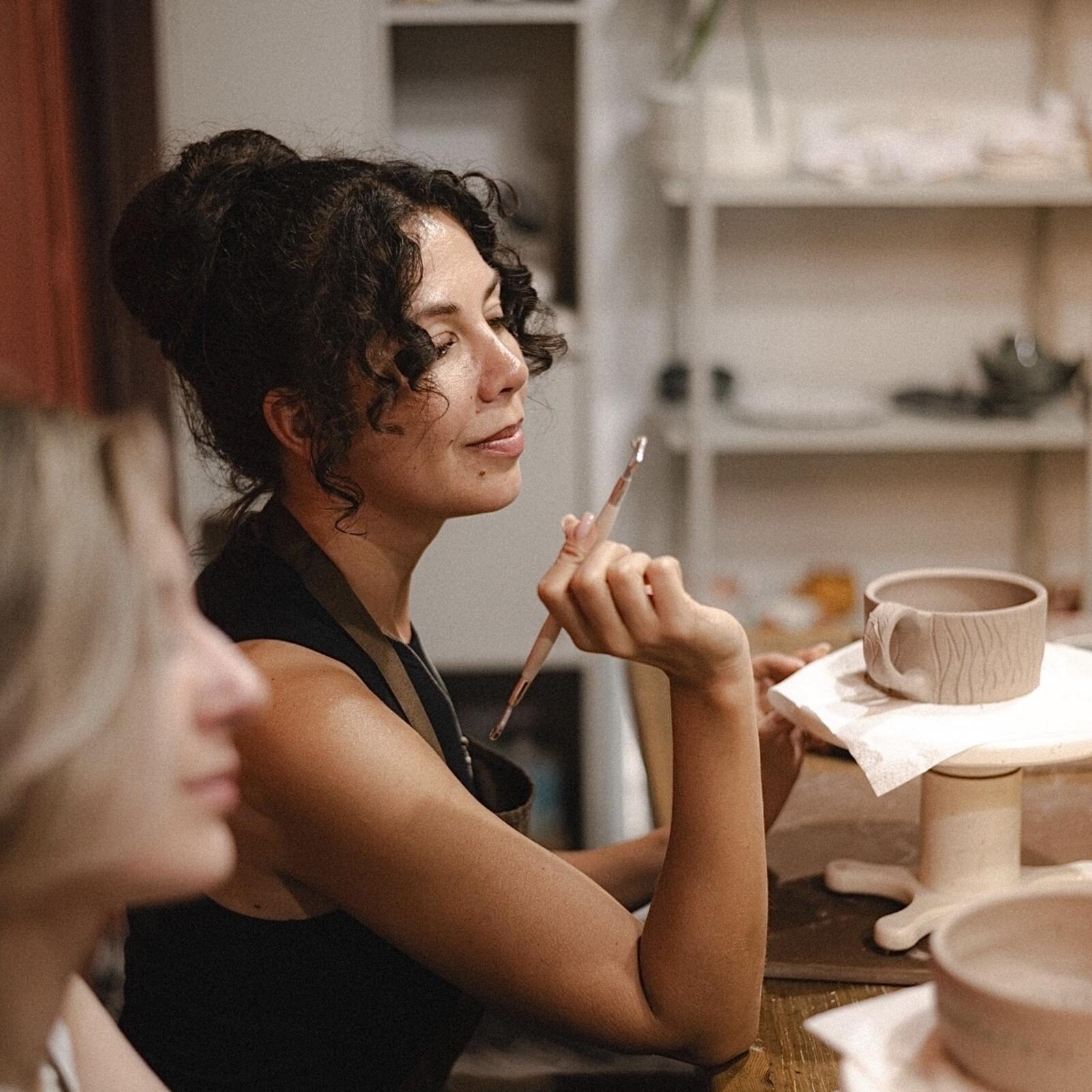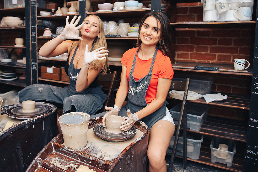 Создаёте все вместе кружки, тарелки или другие формы на гончарном круге или в технике ручной лепки. Мастер уделяет внимание каждому.